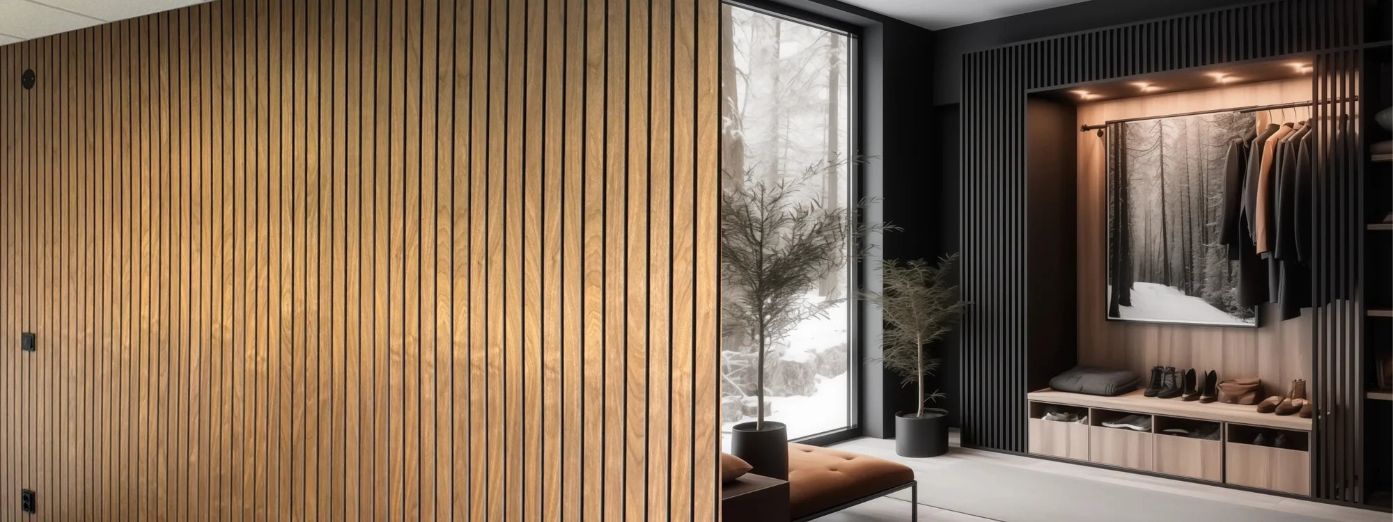 Våra akustikpaneler består av en ljudabsorberande filt (9 mm PET, varav 50 % återvunnen) och ribbor i MDF belagda med äkta träfanér. Du kan välja mellan valnöt, teak, ask och flera nyanser av ek – alla FSC-certifierade för ett hållbart skogsbruk.